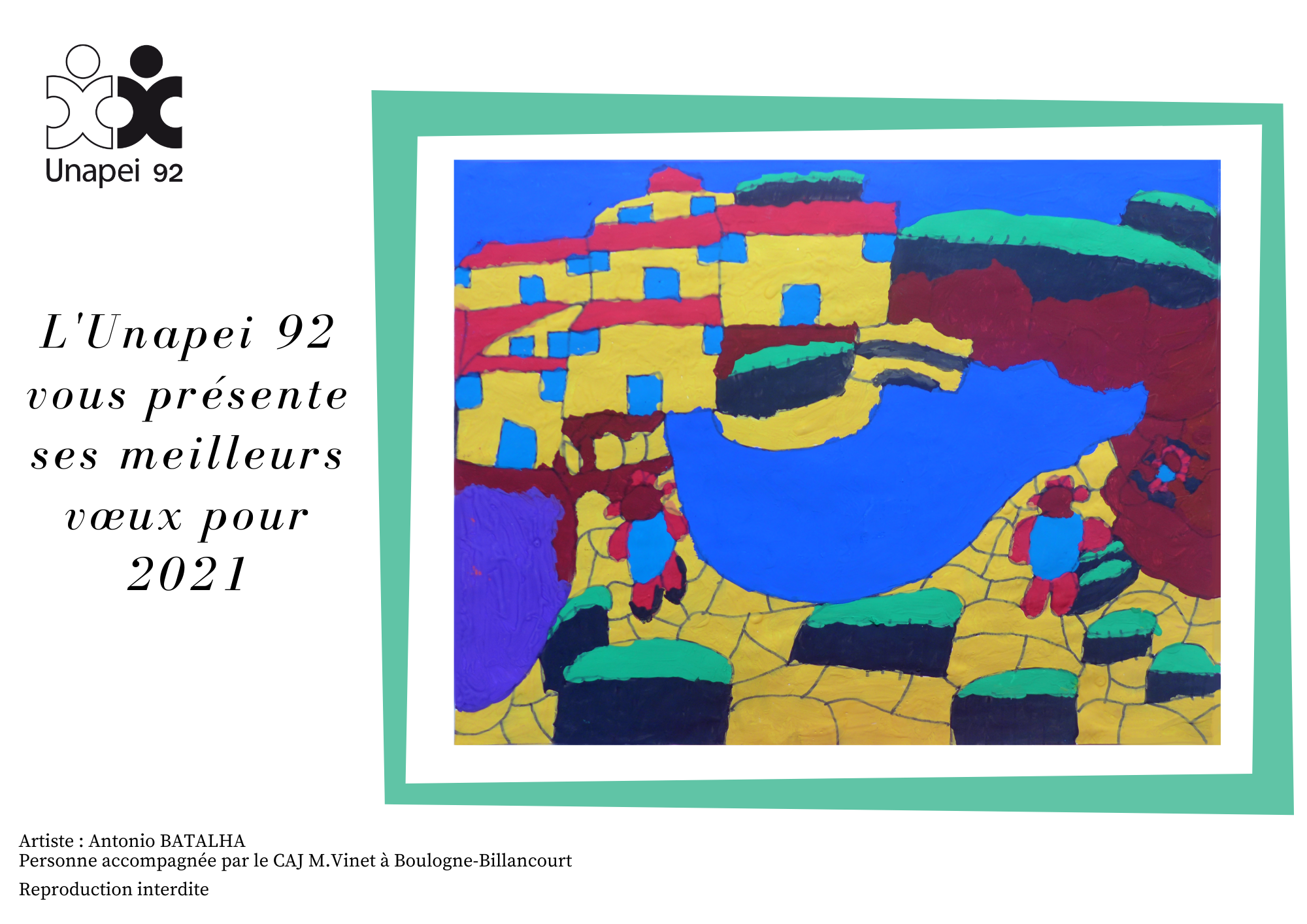 A l’issue d’un challenge interne auprès de plusieurs établissements de l’Association, issus du pôle Hébergement, Accueil de jour & Habitat inclusif, c’est une création originale d’ Antonio Batalha, personne accompagnée par le CAJ Madeleine Vinet à Boulogne Billancourt qui a été retenu pour illustrer la carte de vœux Unapei 92.